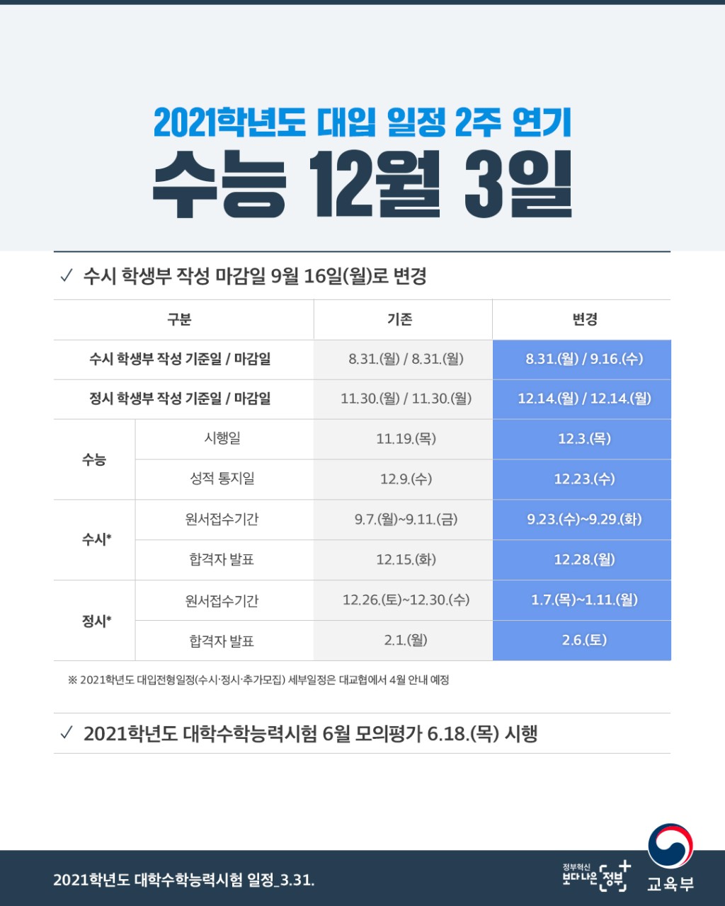 - 수능 시행일 등 2021학년도 대학 입시 일정 조정